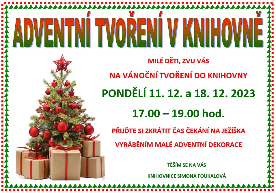 Vážení občané, srdečně Vás zveme na "adventní tvoření" v naší místní knihovně dne 11. 12. 2023 a 18. 12. 2023 v čase od 17:00 – 19:00 hodin. Budeme se těšit na setkání, vyrobíme si malé adventní dekorace.
